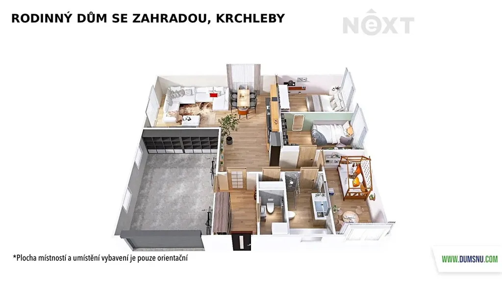Dále zde naleznete samostatnou toaletu a moderní koupelnu vybavenou vanou i sprchovým koutem. K dispozici jsou také tři samostatné pokoje, které mohou sloužit jako ložnice, dětský pokoj nebo pracovna či studovna. Součástí domu je garáž a spíž, která poskytuje dostatek úložného prostoru.