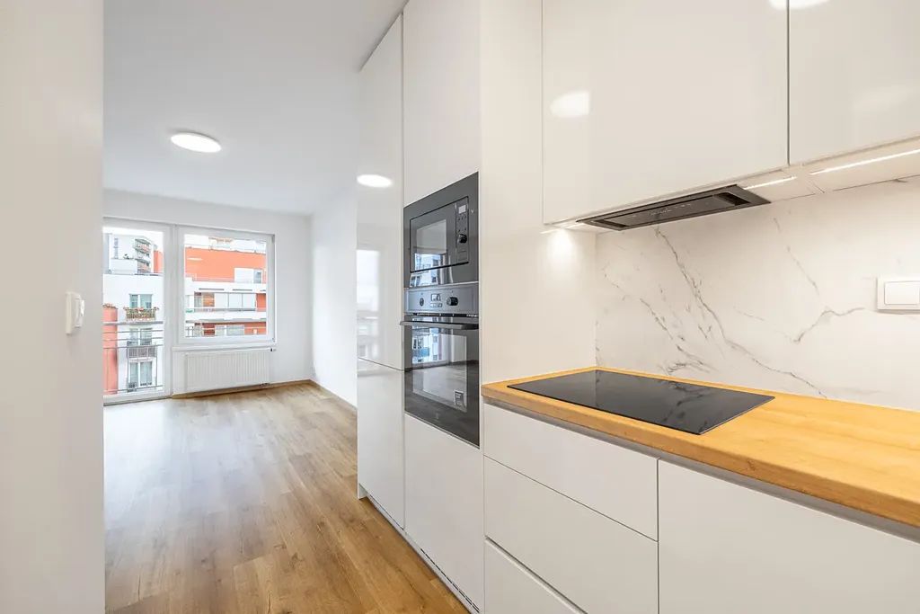 Byt vypadá přesně jak vidíte na fotografiích, nejedná se o vizualizaci. Kuchyně je vyrobena na míru a kompletně vybavená spotřebiči (elektrická trouba, mikrovlnná trouba, indukční deska, myčka). Kuchyně je velkorysá s důrazem na dostatek úložných prostor a pohodlí při každodenním využívání. Společně ve velkém obývacím pokoji s přístupem na balkon tvoří tak příjemný a rozsáhlý prostor pro rodinu - 30 m2. Koupelna je s vanou, sprchovým koutem, podlahovým topením a designovým umyvadlem na praktické skříňce se dvěma zásuvkami. Samostatná toaleta má vlastní umyvadlo a navíc dvě zásuvky. V chodbě je komora s přípravou na pračku. Byt má dostatek místa na vestavěnné skříně.
