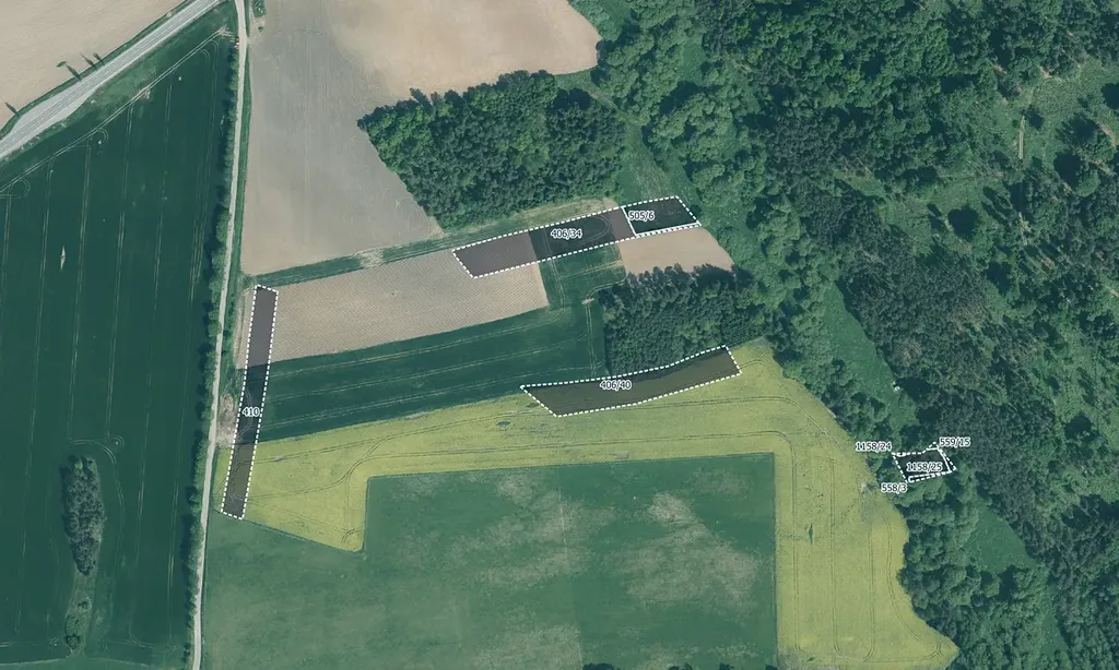 Pozemky jsou vedeny pod čísly 64/1, 100/9, 107/1, 160/12, 160/29, 160/30, 170/9, 182/7, 192/1, 194/6, 406/34, 406/40, 410, 505/6, 531/2, 545/3, 558/3, 559/15, 584, 714/10, 720/6, 809/1, 1002/31, 1060, 1061, 1143/10, 1149/3, 1151/13, 1156/28, 1158/24 a 1158/25.