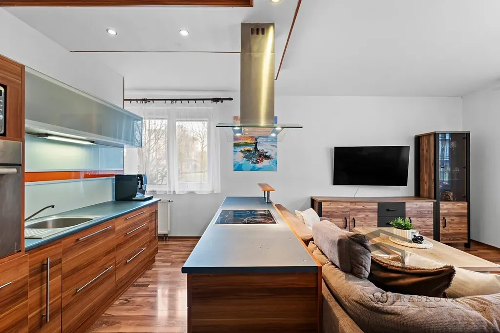 Udržovaný bytový dům z roku 2007 a s klasifikací PENB C, se nachází na adrese Hakenova 929/2. Bytová jednotka je situována v příjemném prostředí moderní zástavby, konkrétně v přízemí s okny do boční ulice a na dětské hřiště. Byt s podlahovou plochou 65 m2 disponuje předsíní s úložným prostorem/komorou, vstupem do koupelny, na toaletu, do dětského pokoje a obývací části. Z této části je přístupná i ložnice (6,4 m2). Obývací pokoj (30,7 m2)včetně kuchyňského koutu se samostatným moderním ostrůvkem nabízí dostatek místa pro sedací soupravu i jídelní stůl. Kuchyňský kout je vybavený varnou deskou, závěsnou digestoří, elektrickou horkovzdušnou troubou, myčkou, mikrovlnou troubou, lednicí a dostatkem úložného prostoru. Dětský pokoj (14 m2), kam se vejdou i 2 dětské postýlky nabízí příjemný výhled na dětské hřiště. Koupelna s vanou a pračkou je umístěna od toalety separátně. Okna jsou plastová dvojskla s roletkami, umístěna na jihozápadní světovou stranu. Vytápění bytu a ohřev vody je dálkově z teplárny. Byt je klasifikovaný jako 2+kk, ale rozdělený příčkou na 3+kk.