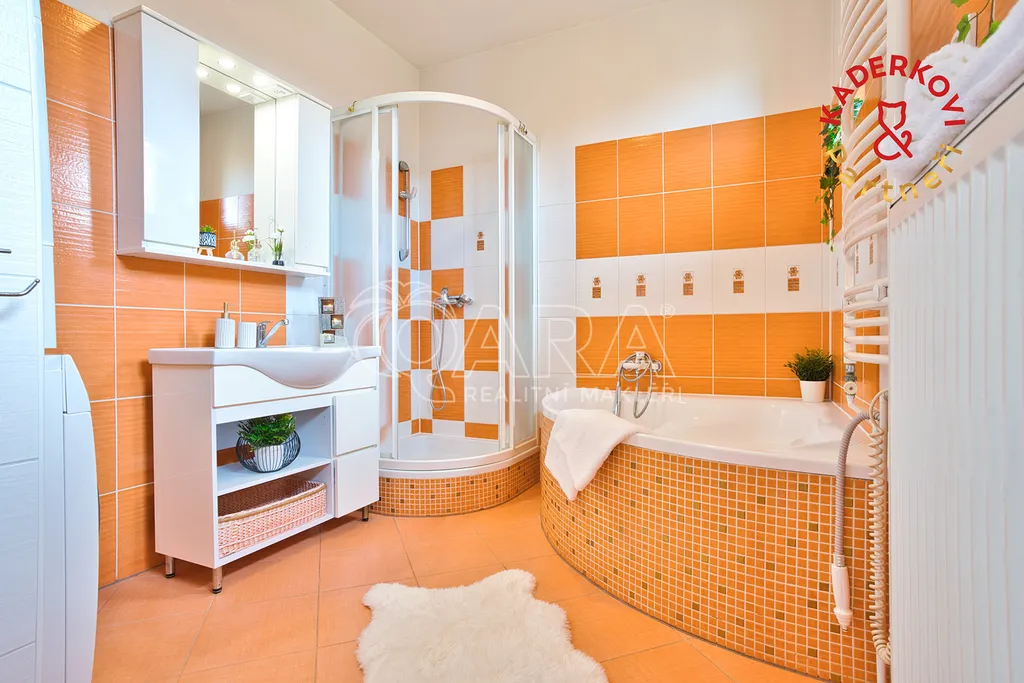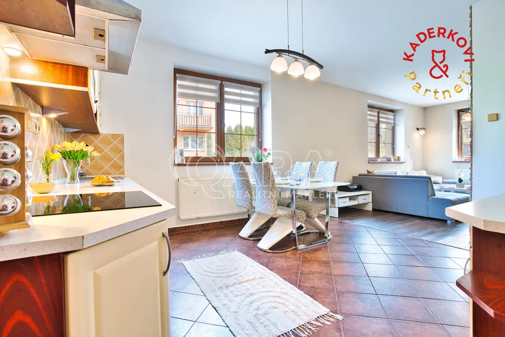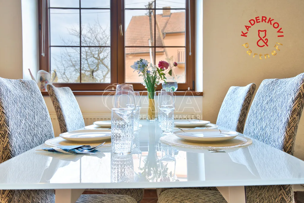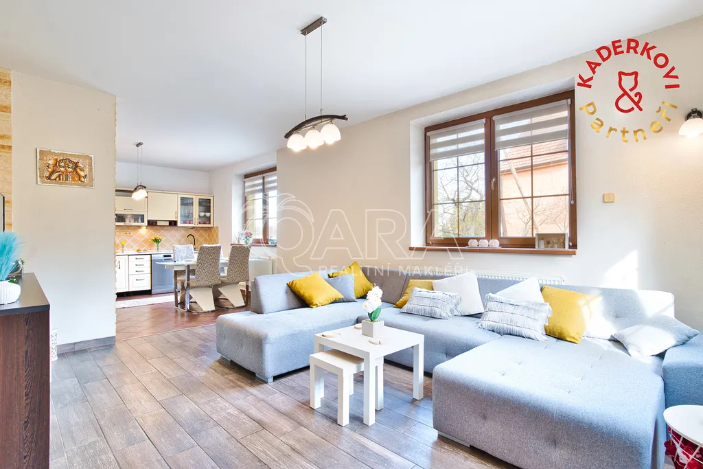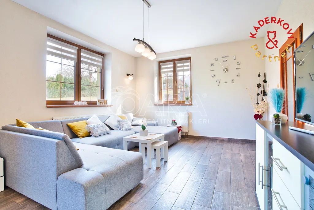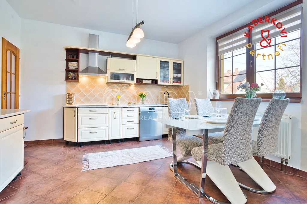 Srdcem celého domu je prostorný obývací pokoj s kuchyňským koutem, kam díky třem velkým oknům proudí spousta denního světla. Kuchyně je prakticky řešená a poskytuje dostatek místa pro každodenní vaření i větší rodinné oslavy.