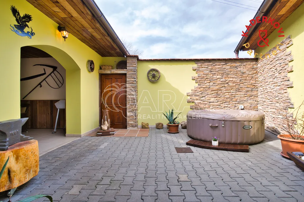 V zadní části domu se nachází uzavřený dvorek se zastřešeným posezením. Ideální pro grilování s přáteli, dětské hry nebo chvíle odpočinku s kávou a knihou. Dvorek je chráněný před okolím a poskytuje klid a soukromí. Můžete si zde umístit bazén či nafukovací vířivku, která je součástí vybavení domu.
