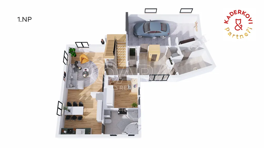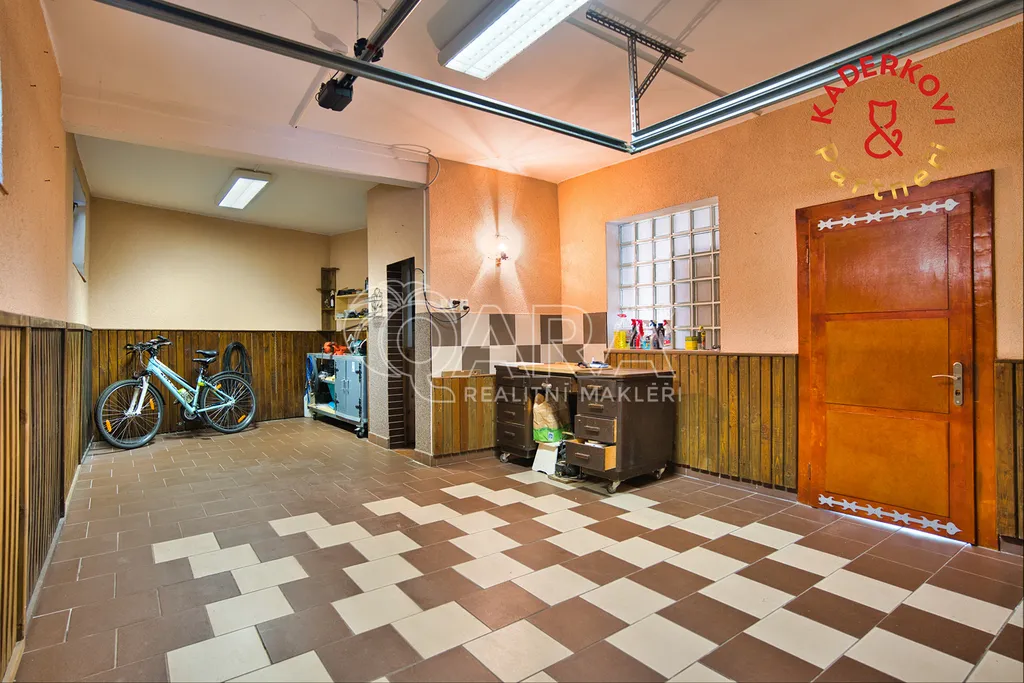 Parkování je zde řešeno štědře – kromě prostorné garáže je k dispozici také zastřešené stání a další plocha pro návštěvu.
