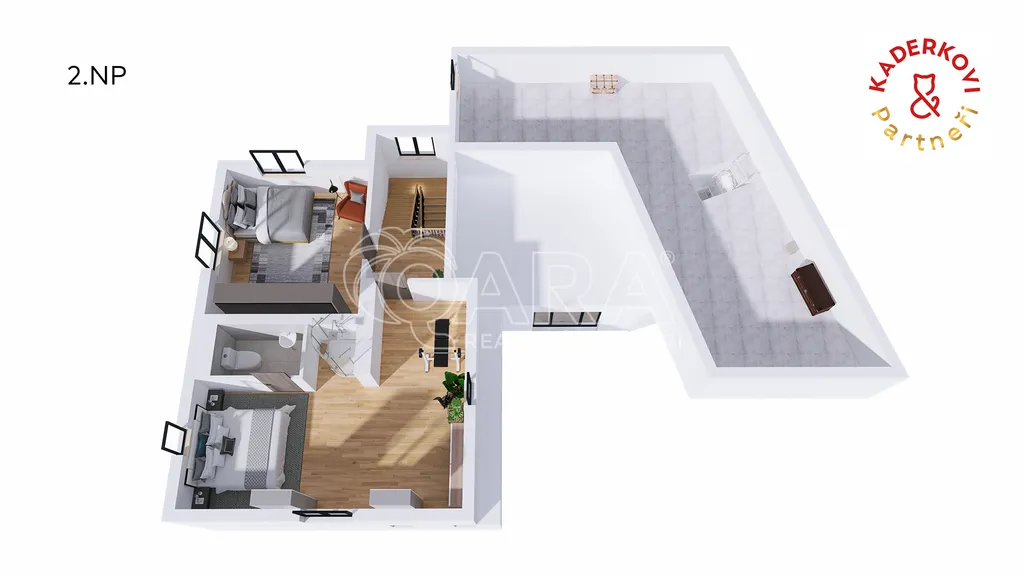 V horním patře najdeme ložnici se soukromým sprchovým boxem a samostatnou toaletou. Příjemné ranní osvěžení ve sprše je tak doslova pár kroků od postele. Další pokoj využijete například také jako dětský pokoj či útulné zázemí pro hosty.