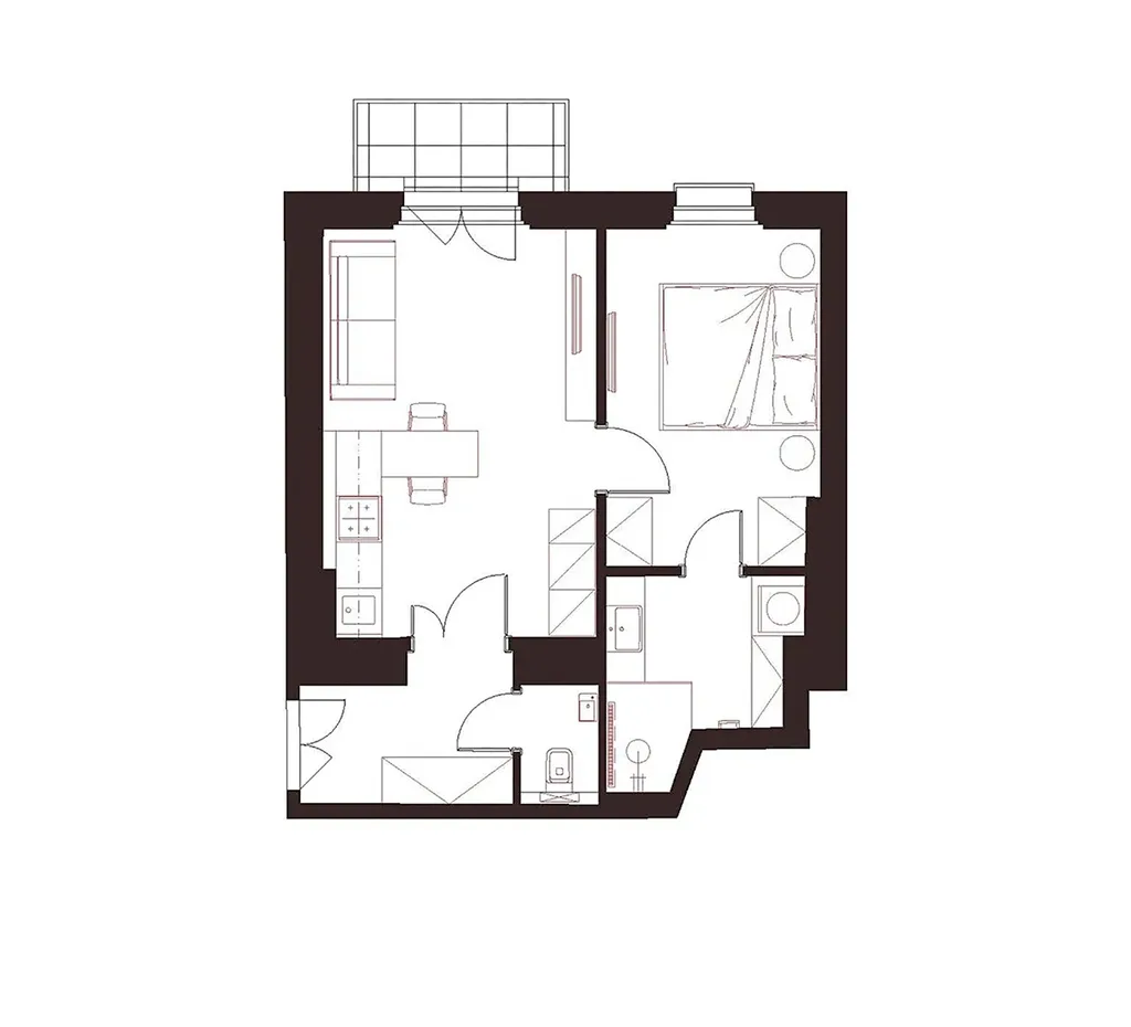 Půdorys bytu v 5. podlaží zahrnuje obývací pokoj s přípravou na kuchyni, ložnici, vstupní chodbu, koupelnu a toaletu. K jednotce náleží také balkon a sklepní kóje. Vybavení zahrnuje dubové podlahy, dřevěná špaletová okna s dvojsklem, elegantní interiérové dveře, koupelnu s mramorovými obklady se sanitou značek Laufen a Grohe a decentně řešená otopná tělesa a elektroinstalaci, která neruší celkový výraz interiéru. Byt bude dokončen v provedení fit out – připravený k okamžitému nastěhování.