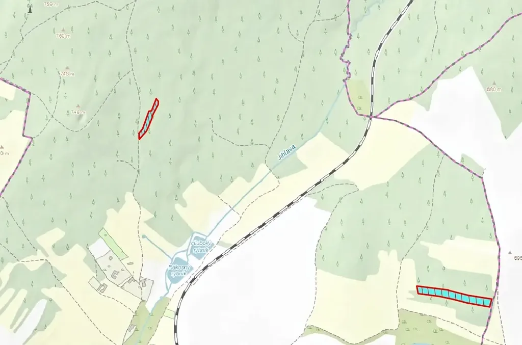 Lesní pozemky o celkové výměře 10.463 m2 v k. ú. Jihlávka. Jedná se o různověký smíšený vzrostlý les (smrk, borovice, buk, bříza).