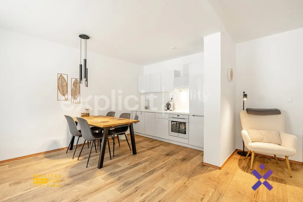 Na obývací pokoj navazuje kuchyň s jídelní částí, kde se nachází jídelní stůl se čtyřmi židlemi. Kuchyň je plně vybavená – k dispozici je vestavná lednice, varná deska, vestavná trouba, digestoř, kávovar a rychlovarná konvice.