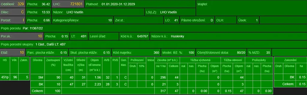- p.č. 11367/22 vedená jako lesní pozemek o celkové výměře 6 642 m2 (stáří lesa 102 let - zastoupení dřevin smrk, buk, stáří lesa 44 let - zastoupení dřevin smrk, habr, stáří lesa 24 let - zastoupení dřevin smrk),