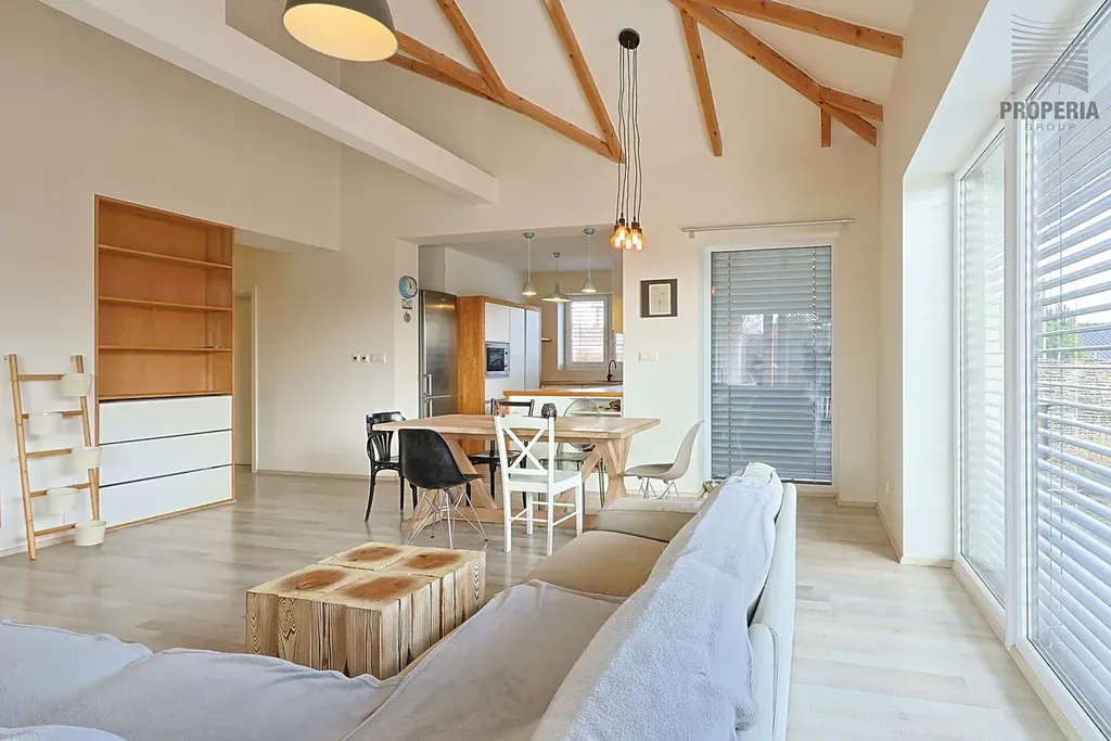 Dominantou domu je prostorný obývací pokoj s jídelnou (31 m²) s kuchyňským koutem 8,4 m² a zvýšeným stropem umocňující bydlení v domě. Dům nabízí tři samostatné pokoje, koupelnu s WC a samostatné WC.