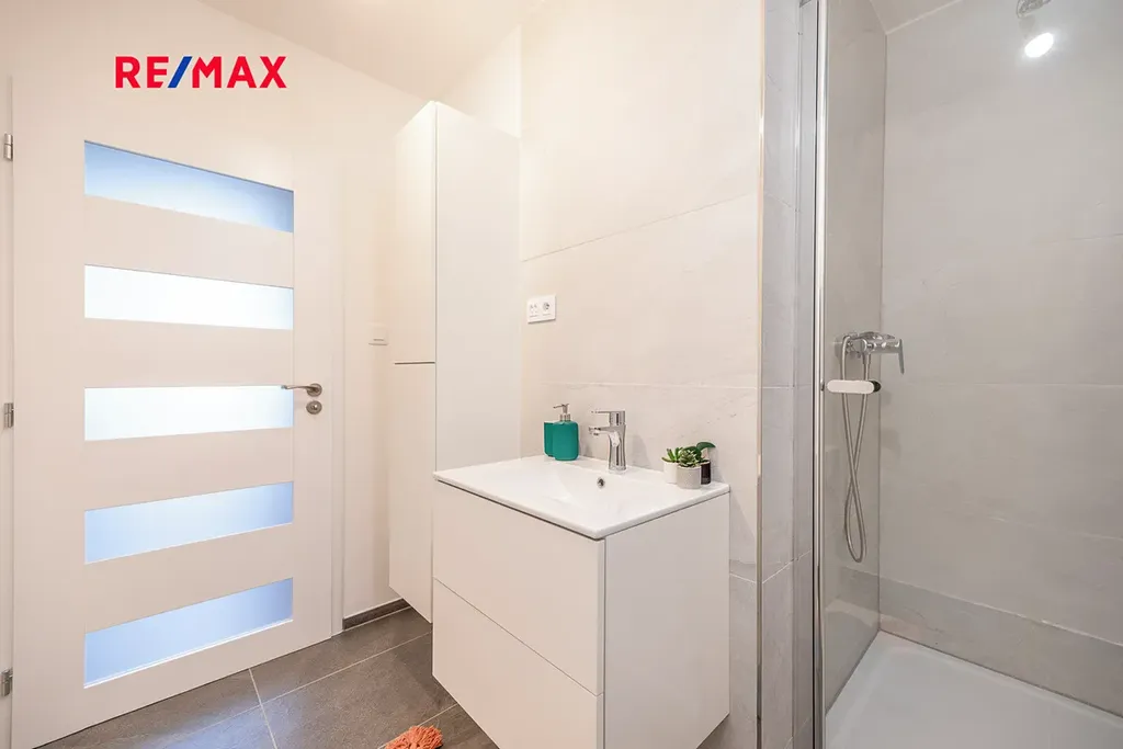 V předsíni je jak prostor na vestavnou skříň, tak walk in šatna. Koupelna má prostorný sprchový kout a toaleta je samostatná a nadstandardně prostorná.