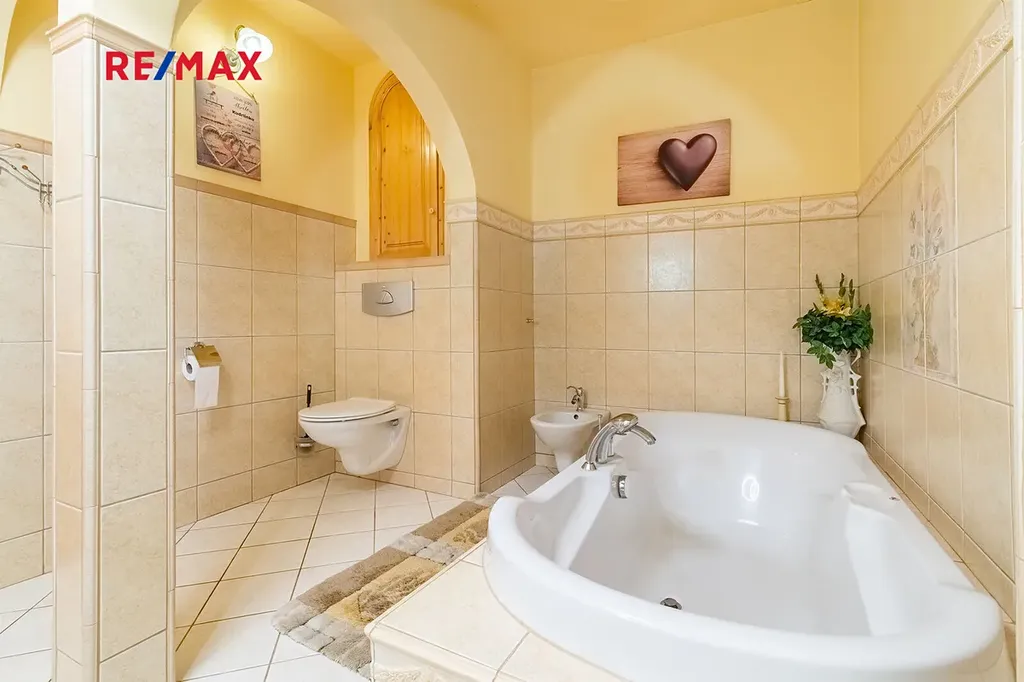 V 1.NP se nachází prostorná hala s krásným smrkovým schodištěm, fitness, technická místnost, ložnice, prádelna, samostatné wc a koupelna s vanou, bidetem a toaletou. Srdcem domu je otevřený prostor obývacího pokoje, kde je dominantou krb s francouzskou vložkou, moderní kuchyní s ostrůvkem a navazující jídelnou, ze které je možnost vejít na terasu. Zde je hotová příprava na zapuštěný bazén a najdeme tady dostatek prostoru k relaxaci a odpočinku.