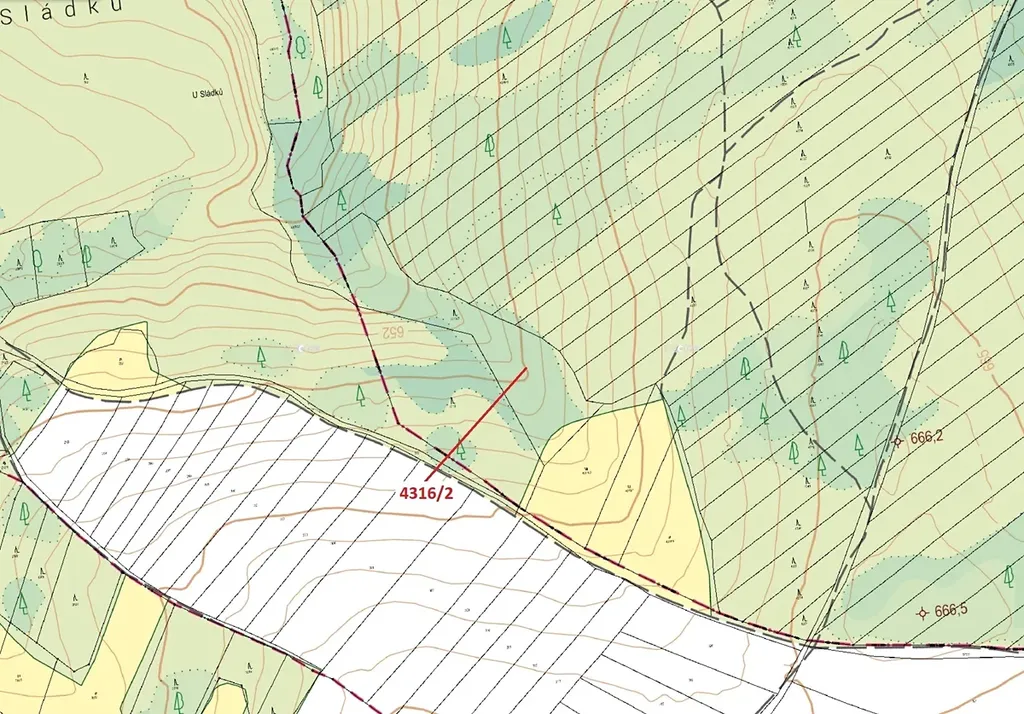 "Lesní pozemek o výměře 7085 m2, parcelní číslo 4316/2, podíl 1/1, katastrální území Opatov na Moravě, obec Opatov, obec s rozšířenou působností Třebíč, okres Třebíč, Kraj Vysočina. "