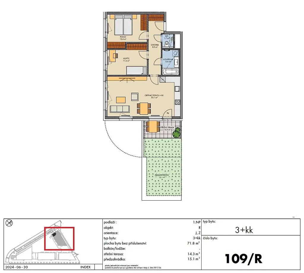 Bytová jednotka 3+kk o velikosti 71,8 m2 + terasa 14,3 m2 + předzahrádka 15,1 m2 se nachází v 1. nadzemním podlaží (z celkových šesti) s orientací na jih a západ.