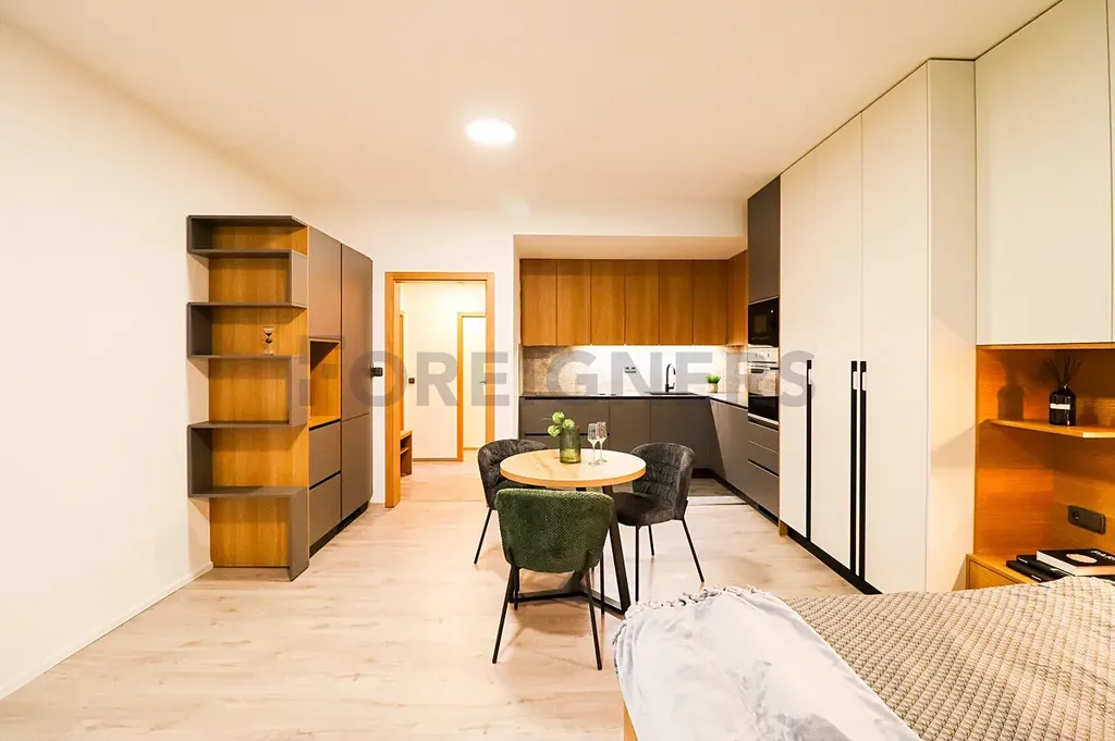 Byt se skládá ze vstupní chodby s úložnými prostory a malou šatnou, obytného pokoje s kuchyňským koutem, koupelny se sprchovým koutem a umyvadlem, toaletou a multifunkční pračkou se sušičkou. Tento moderní byt je ideální pro 1 až 2 osoby.