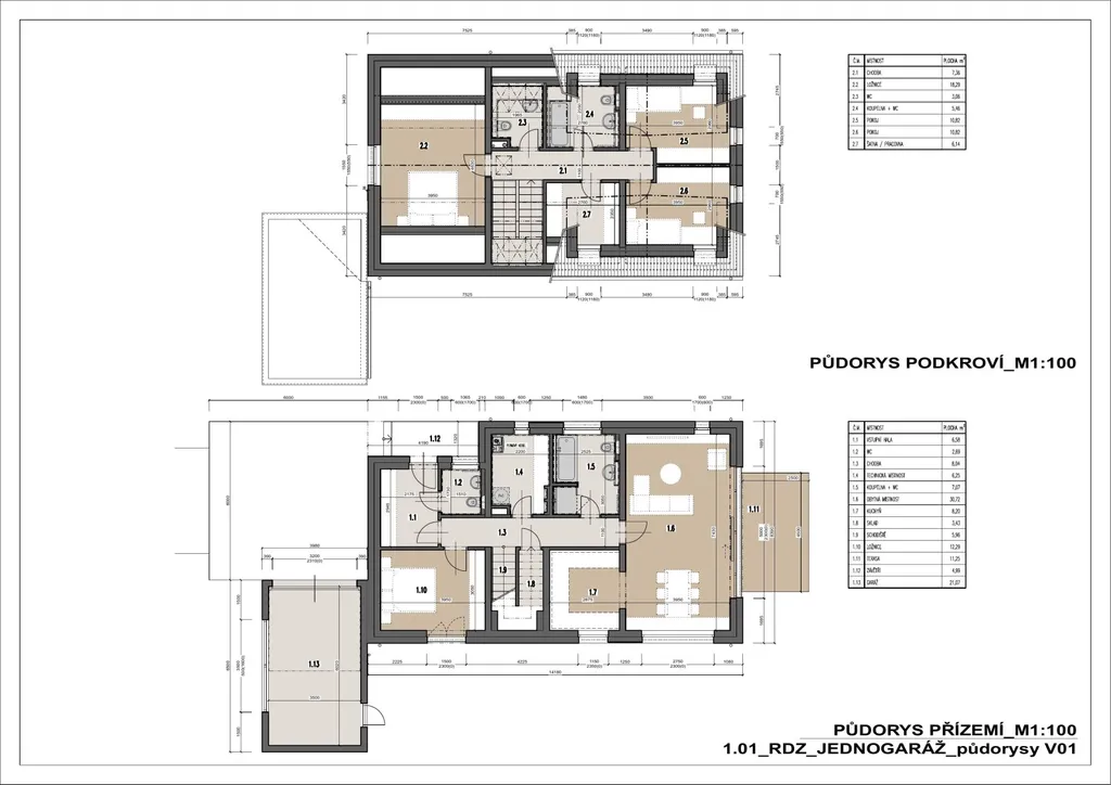 Dispozice 1.NP: vstupní závětří(5m2), vstupní hala(6,58m2), samostatné WC(2,69m2), tech.místnost(6,25m2), koupelna s WC(7,07m2), obývací pokoj s kuchyní(38,92m2), sklad(3,23m2), chodba(8,04m2), ložnice(12,29m2), terasa (11,25m2).