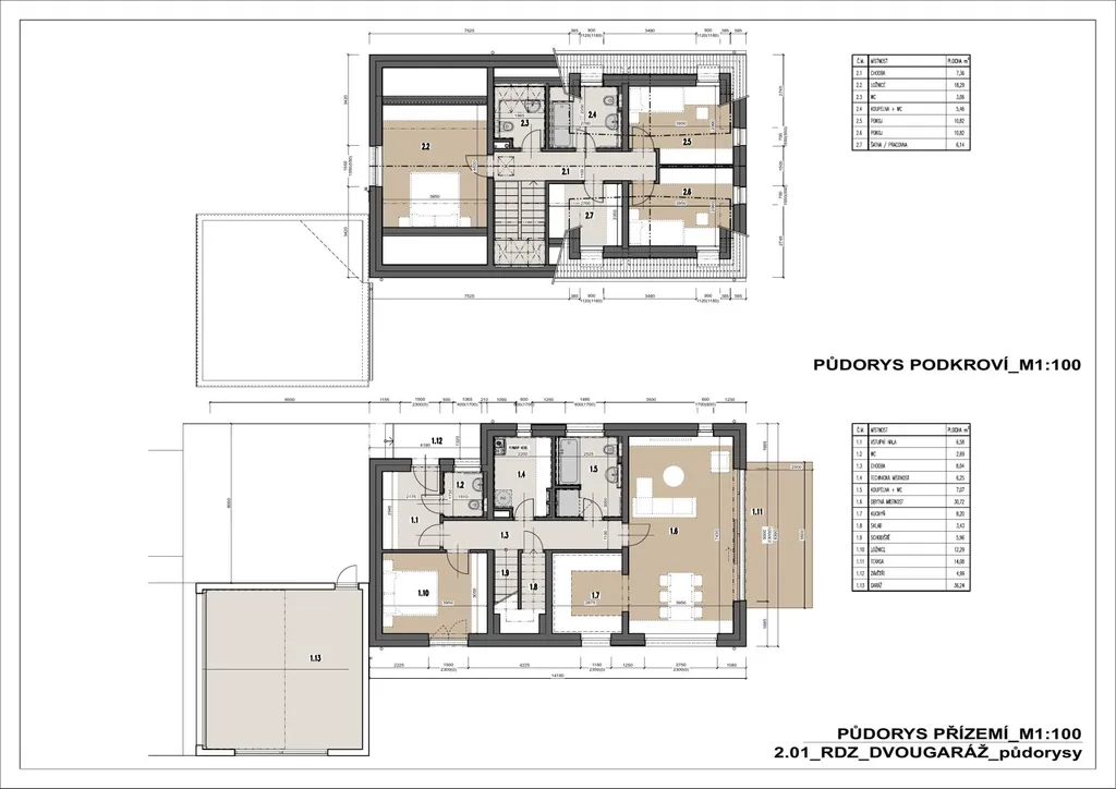 2.NP: chodba(7,36m2), samostatné WC(3,09m2), koupelna s WC(5,46m2), 3 ložnice(18,29m2 10,82m2, 10,82m2), šatna/pracovna(6,14m2).