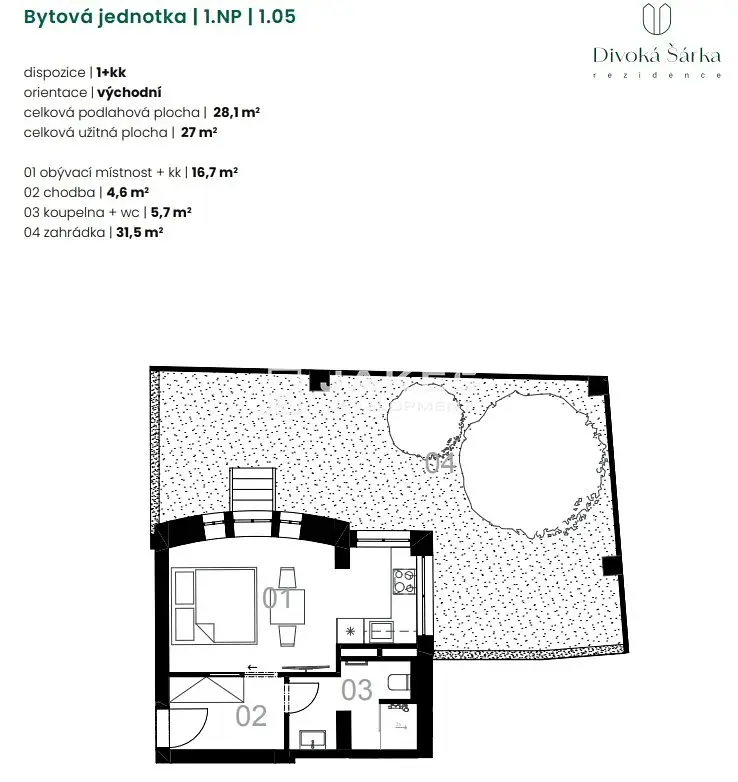 Nabízíme k prodeji byt o dispozici 1+kk a celkové ploše 28,1 m², který je ideální volbou pro vlastní bydlení i jako investice k pronájmu. Velkou přidanou hodnotou je prostorná předzahrádka o velikosti 32 m². Nemovitost nabízí plně vybavenou kuchyňskou linku včetně spotřebičů, instalované osvětlení, šatní skříň a botník v předsíni. V koupelně se nachází sprchový kout. Součástí prodeje je také parkovací stání, které zajišťuje pohodlné parkování bez starostí, sklepní box v suterénu domu.