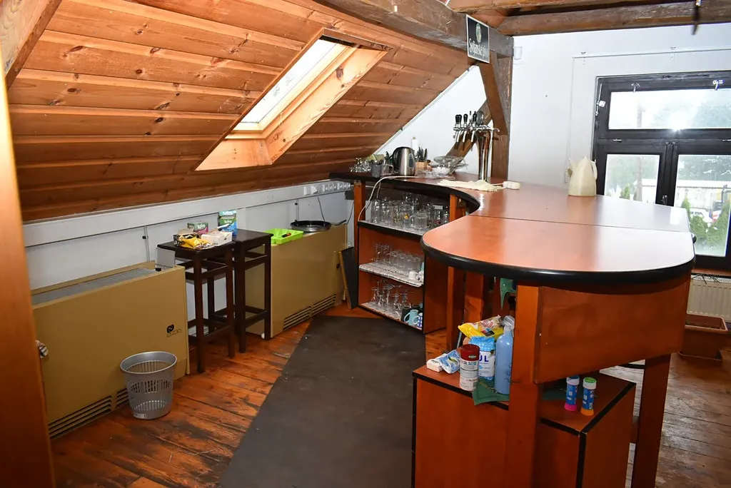 V patře se nachází stylová místnost s barem a kuchynkou. Zde se dají točit různé nápoje a připravovat různé dobroty. Je zde i mistnost pro ruzné hry a WC dámské a pánské. Součástí je i galerie s pěkným výhledem na oslavence.