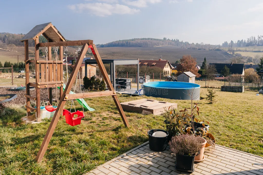 Interiér je částečně vybaven, výraznou předností je krásná kuchyňská linka vybavená moderními spotřebiči. Podlahové vytápění je zajištěno tepelným čerpadlem, což přispívá k nízkým provozním nákladům a komfortnímu vytápění. Na zahradě se nachází bazén, který doplňuje volnočasové možnosti a zvyšuje atraktivitu nemovitosti. Na zahradě je také založen ovocný sad (švestka, broskev, jabloně, třešně, rakytník), ale najde se tu i prostor pro pěstování vlastní zeleniny. Vlastní zdroj dešťové vody na zálivku přispívá k větší udržitelnosti a snížení nákladů.
