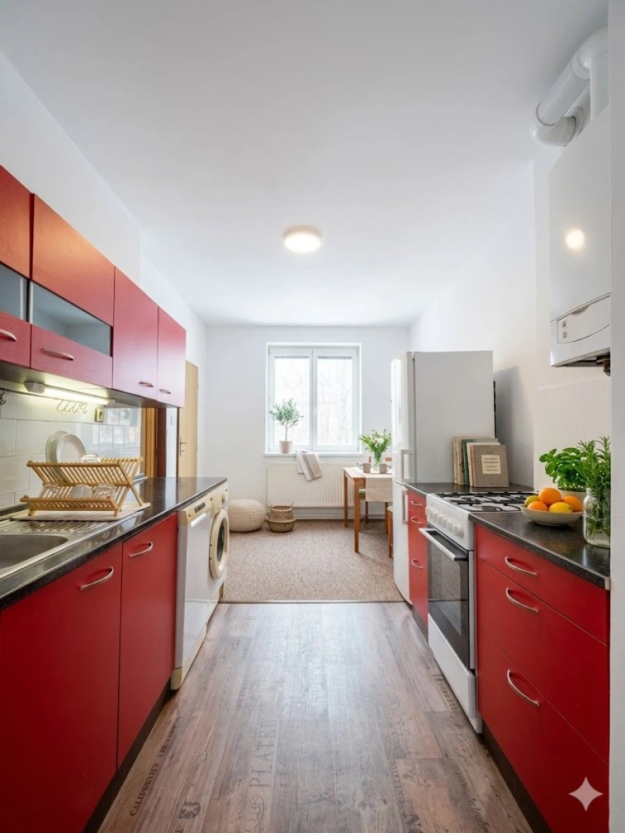 Kuchyně je plně funkčně vybavena: myčka, lednice s mrazákem, elektrická trouba, plynový sporák, digestoř, mikrovlnná trouba a jídelní stůl se třemi židlemi. V pokoji je k dispozici televizor zavěšený na zdi. Samozřejmostí jsou žaluzie v celém bytě.