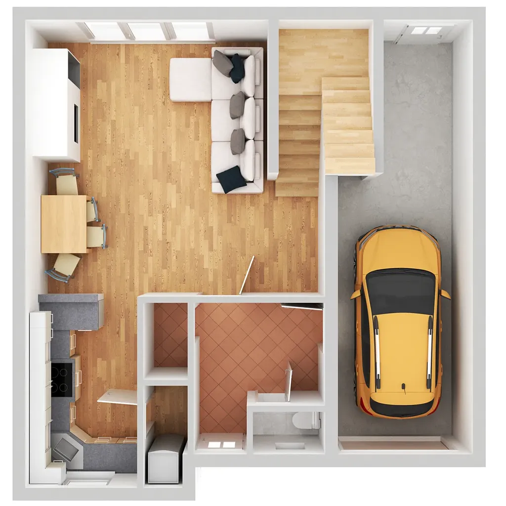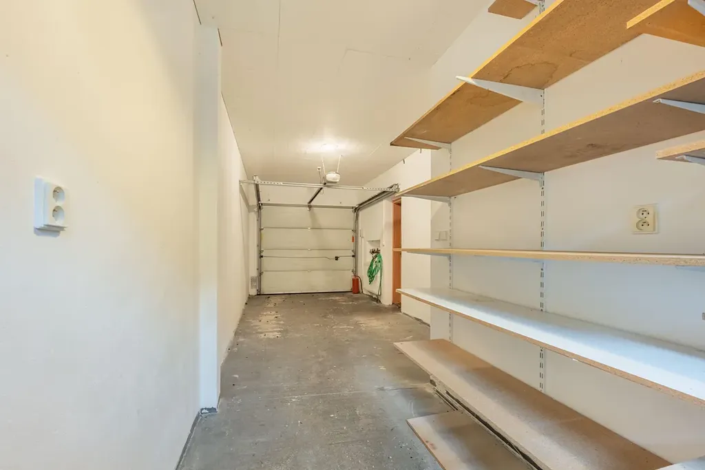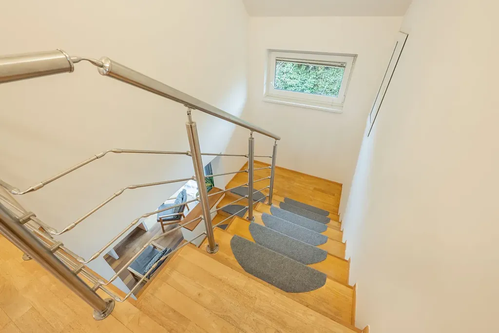 V přízemí se nachází předsíň s wc a šatnou, za ní následuje kuchyň a obývací pokoj, ze kterého jde schodiště do patra. Obývací pokoj je světlý a orientován do zahrádky, na něj navazuje kuchyně s oknem na předzahrádku. V patře najdeme dvakrát kouplenu (jedna s vanou a jedna se sprchovým koutem), šatnu a čtyři pokoje, z nichž jeden je využíván jako pracovna. Obytná plocha 114,9m2, plus garáž 23,4m2. Velikost pozemku 222m2.