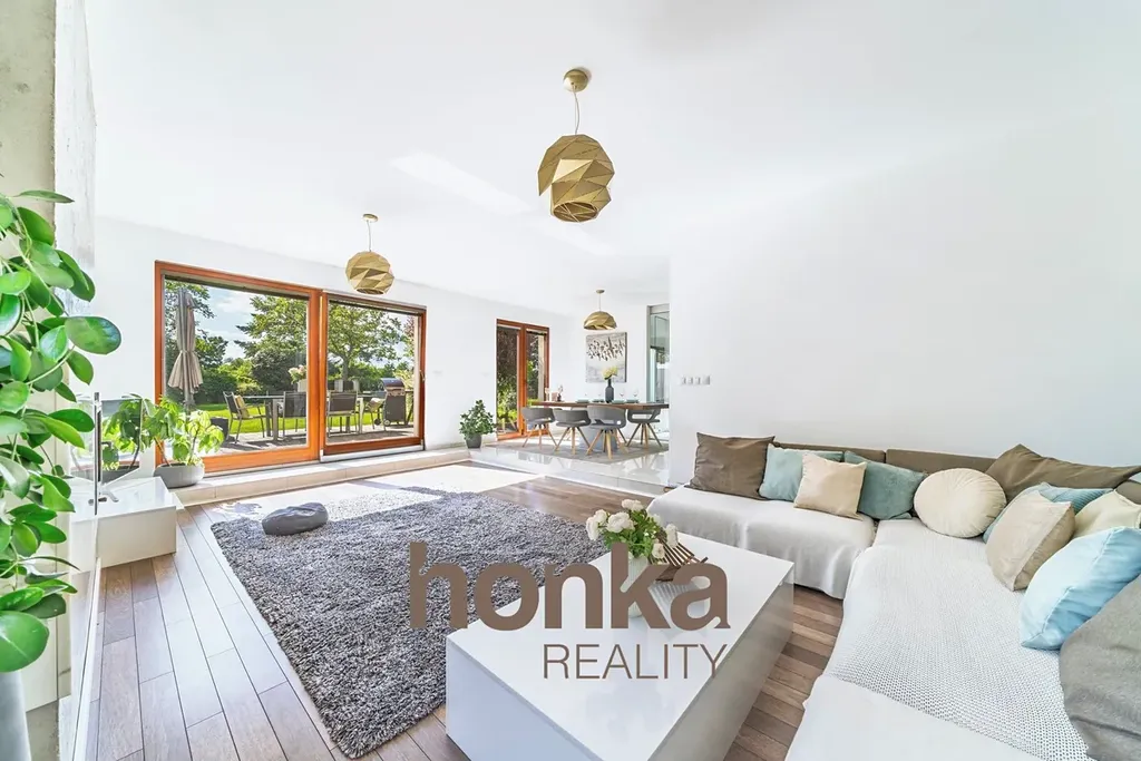 Přízemí: obývací pokoj (29,8 m²) se vstupem na terasu (30 m²), kuchyň, jídelna, pracovna, koupelna a samostatné WC