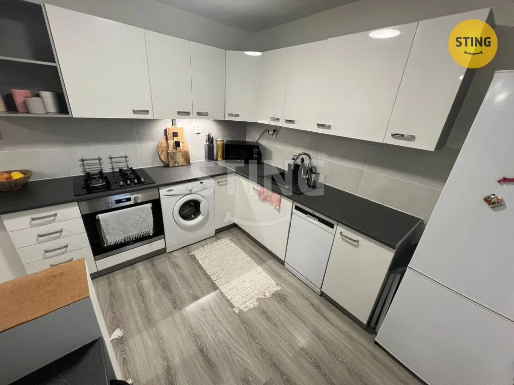 Kuchyň: rohová kuchyňská linka s elektrickou troubou, plynovou varnou deskou a myčkou nádobí. V kuchyni je prostor pro pračku i lednici.