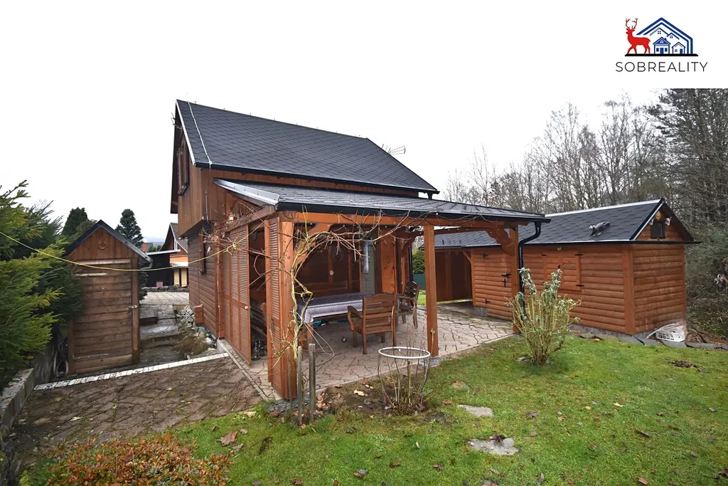 Z boku chaty je také terasa s pergolou o ploše cca 14 m2. a dále se na pozemku nachází dřevěná kůlna na nářadí atd. o výměře cca 13 m2. A tak též je na pozemku umístěna i suchá toaleta s jímkou.