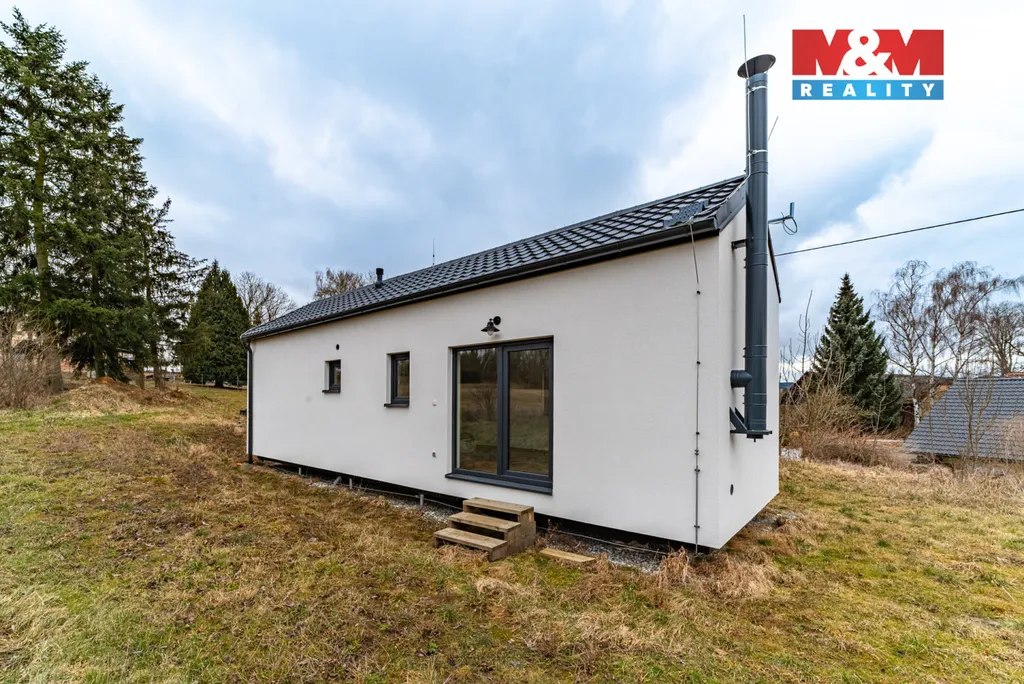 Dispozice zahrnuje obývací pokoj s kuchyňským koutem, samostatnou ložnici, koupelnu s WC, zádveří a sklad. Interiér je dokončen včetně podlah, omítek a oken s izolačními skly. Vytápění je řešeno krbovými kamny a elektrickými přímotopy. Objekt je napojen na elektřinu, zdrojem vody je vlastní vrt a odpad je řešen domovní čistírnou odpadních vod. Nemovitost se nachází v ploše venkovského bydlení dle územního plánu a je vhodná k trvalému bydlení,