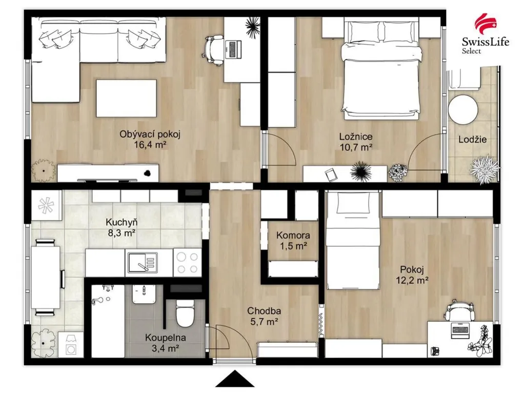 Dispozice bytu nabízí samostatné pokoje, kuchyni, koupelnu, WC a lodžii přístupnou z obytné části bytu. K bytu náleží také sklepní kóje.