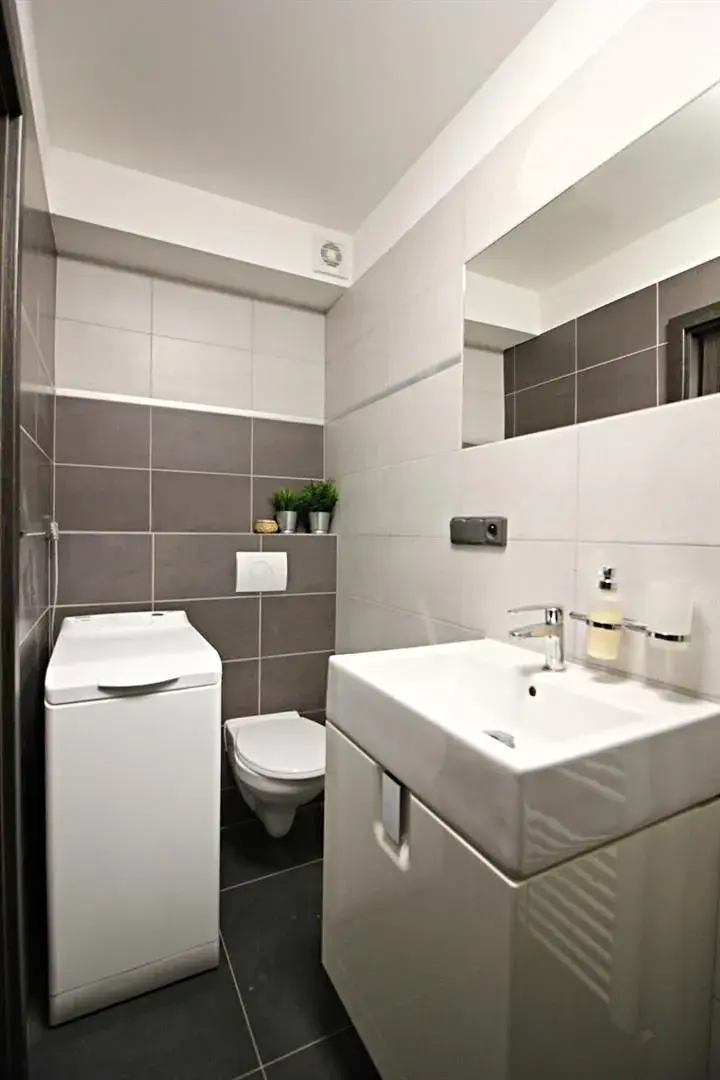 V koupelně je sprchový kout, umyvadlo, toaleta a pračka.
