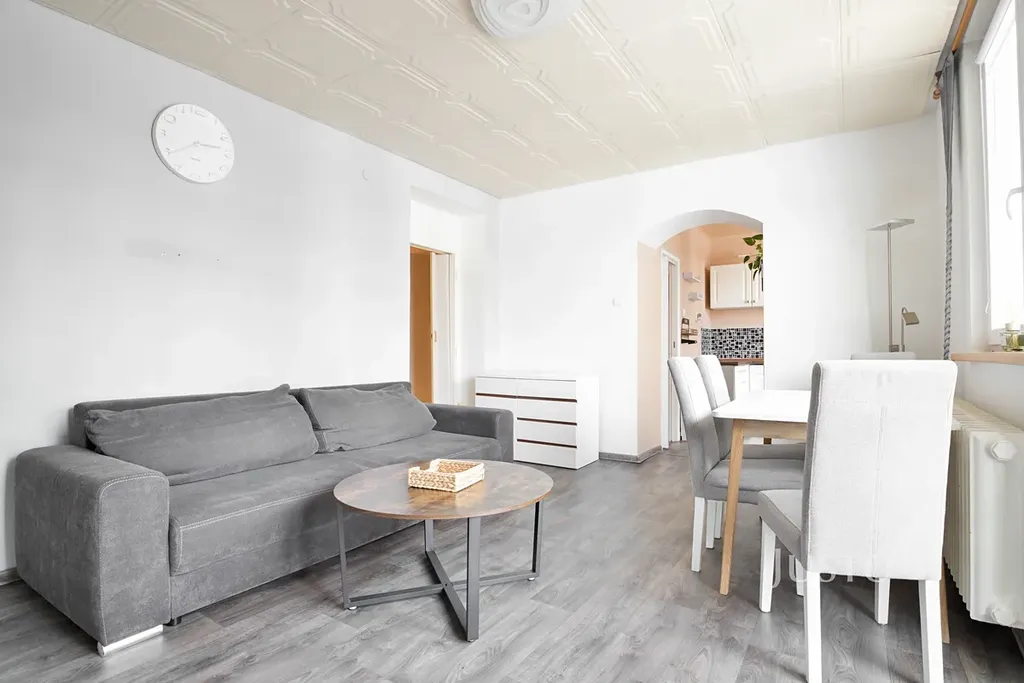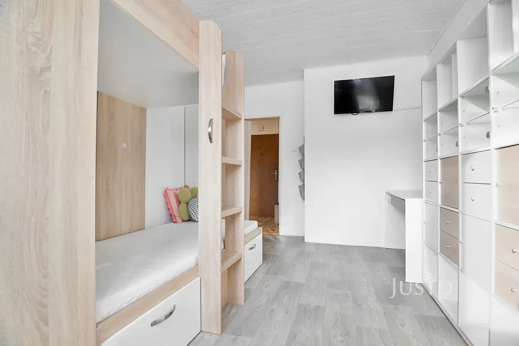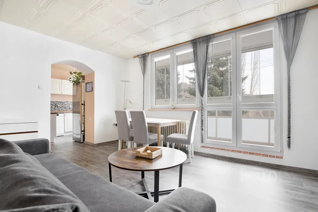 Dispozice bytu nabízí prostorný obývací pokoj s přímým vstupem na lodžii, která poskytuje příjemný výhled do okolní zeleně. Interiér působí svěže a vzdušně díky světlému vybavení a plastovým oknům, která propouštějí dostatek denního světla. K bytu náleží sklep, který nabízí další úložné možnosti.