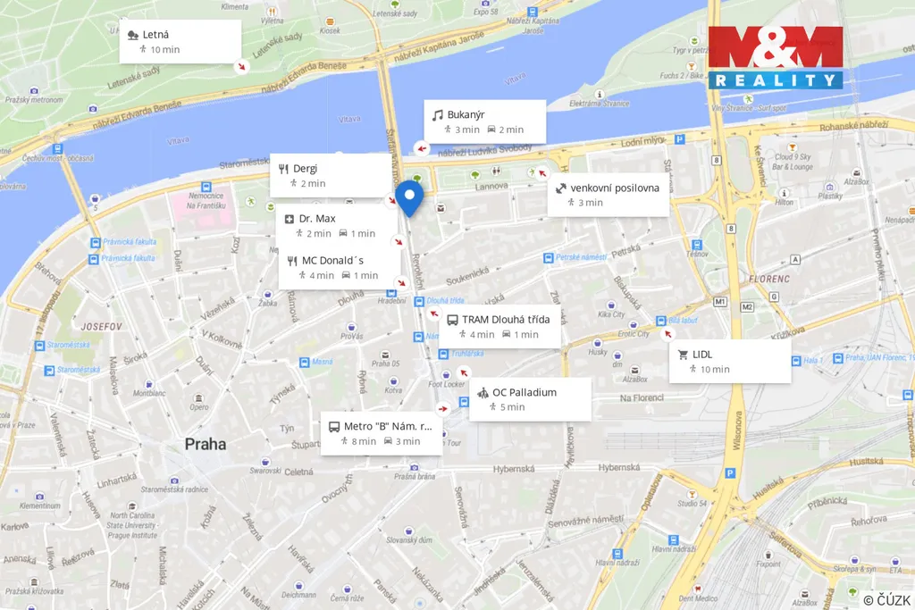 Also suitable for english-speaking clients. Nabízíme k pronájmu nadstandardně zařízený prostorný byt 2+kk s klimatizací o rozloze 92 m² kousek od st. metra B Náměstí Republiky. Byt má neprůchozí ložnici s vyvýšeným patrem, které lze využít pro příjemný odpočinek, k práci či jako úložný prostor. Z obývacího pokoje je vstup na balkón, odkud je mimořádný výhled na Vltavu. Kuchyň je vybavena lednicí, myčkou, indukční varnou deskou, konvicí i kávovarem. V koupelně najdeme vanu, WC i pračku. Byt se nachází v posledním patře cihlového domu s výtahem. Nabízí skvělou dopravní dostupnost – v blízkosti se nachází zastávka tramvaje a autobusu Dlouhá třída, stanice metra Náměstí Republiky je pak vzdálena cca 5 minut chůze. V blízkosti se nachází obchodní dům Palladium, který nabízí kromě nákupních příležitostí i možnost parkování. V okolí je také dostatek zeleně a prostoru pro sport, relaxaci i venkovní aktivity.