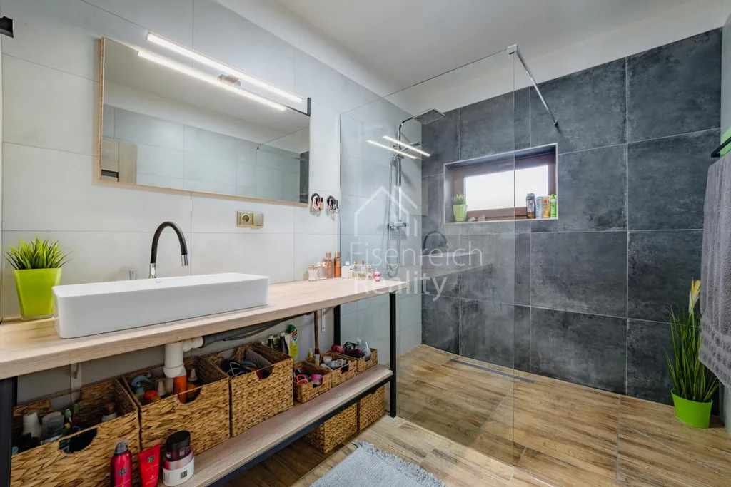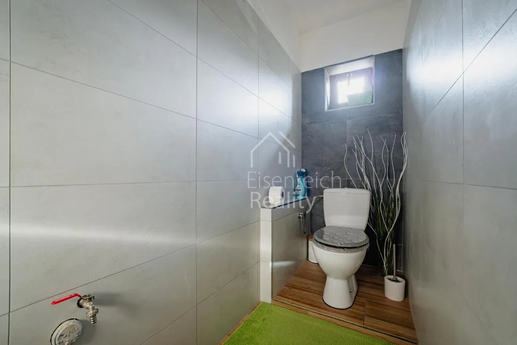 Dispozice domu nabízí dvě koupelny horní koupelna je vybavena vlastním WC, v přízemí domu je navíc samostatné WC. Komfortní řešení ocení zejména rodina s dětmi.