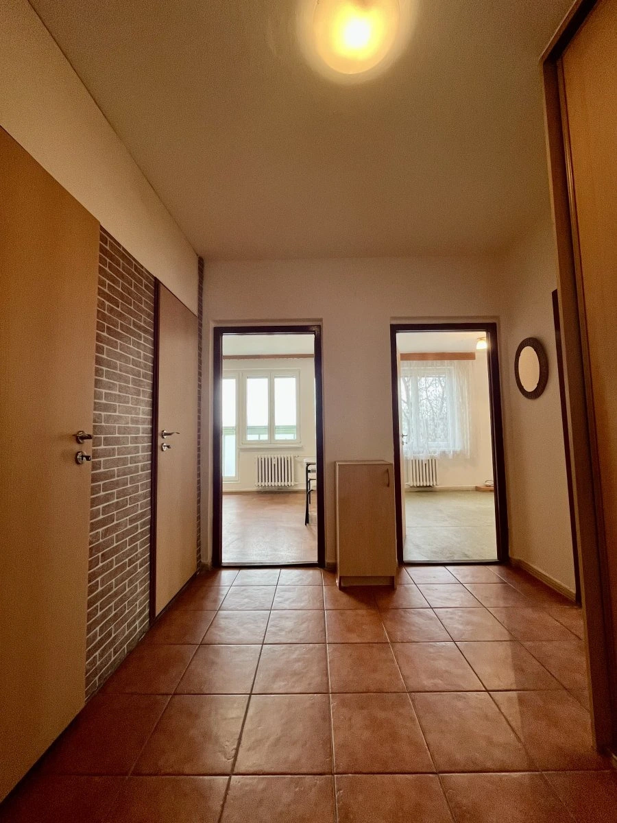 Dispozice bytu je velmi praktická – dva pokoje jsou neprůchozí, jeden průchozí, takže nabízí dostatek soukromí i flexibilitu využití (ložnice, dětský pokoj, pracovna či obývací pokoj). Kuchyně je vybavena elektrickou troubou, plynovým sporákem a digestoří, nechybí ani praktická spíž pro uložení potravin. Koupelna disponuje vanou, umyvadlem a pračkou, toaleta je oddělená. V předsíni oceníte vestavěnou šatní skříň a menší kumbál, který poskytne další úložný prostor. Byt se nabízí částečně vybavený.
