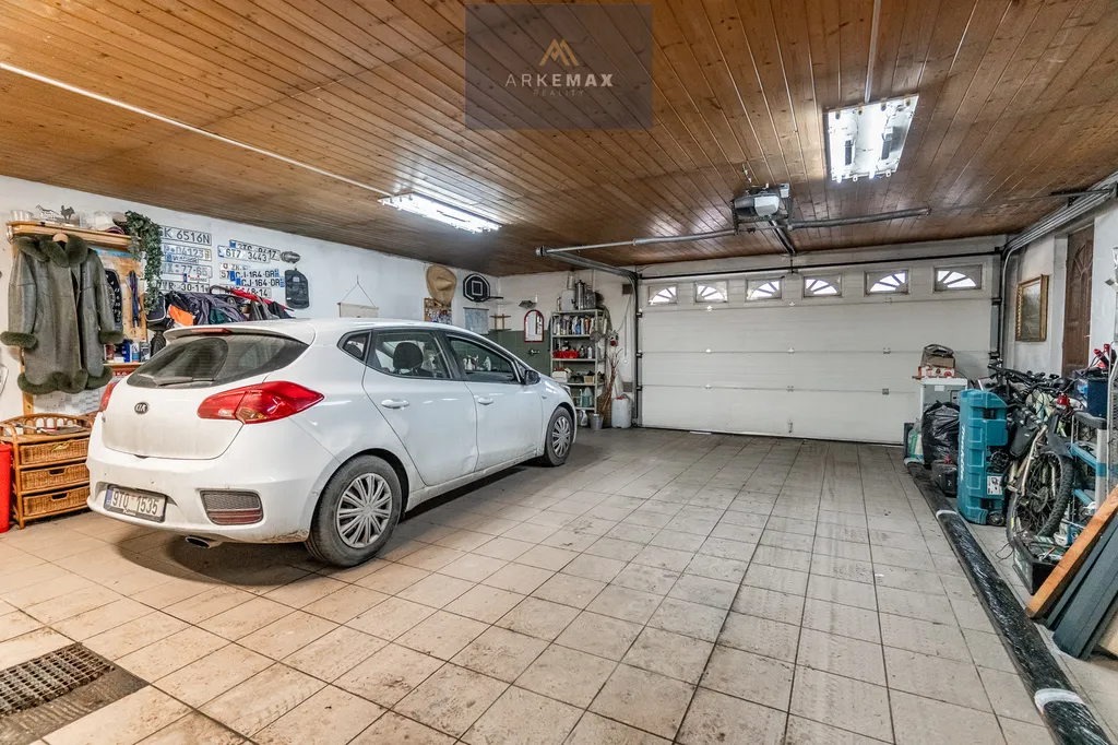 Samostatná vyhřívaná garáž o velikosti 120 m² s automatickou bránou a kapacitou až 6 vozidel.