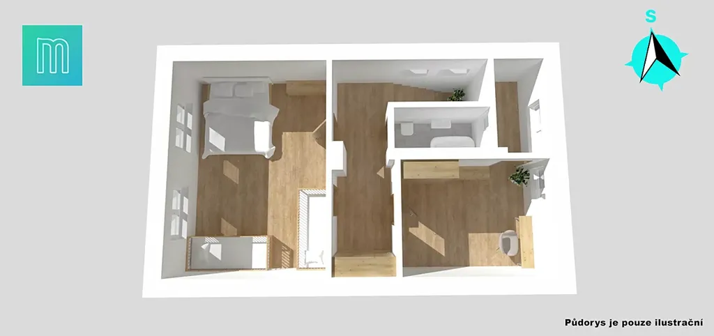 2. NP [54 m²] disponuje dětským pokojem a pracovnou, která může sloužit i jako ložnice a koupelnou vybavenou vanou a toaletou. Důmyslně je zde umístěna vestavěná skříň na chodbě, což zajišťuje dostatek úložného prostoru.