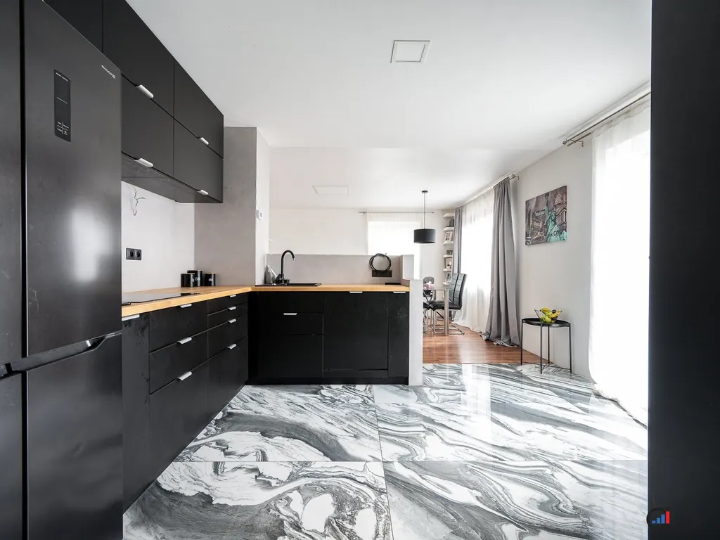 > obývací pokoj s kuchyňským koutem a vstupem na terasu