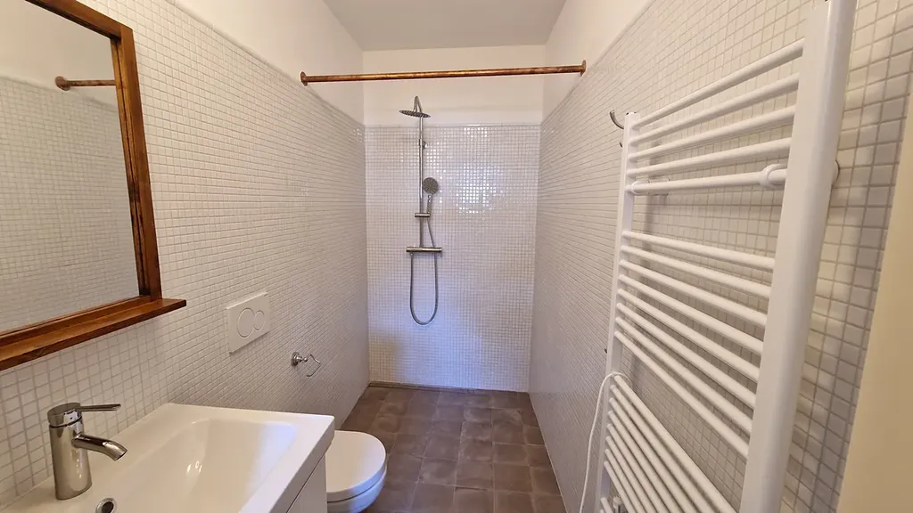 V bytě se topí elektrikou a je i klimatizovaný. Vybavený kuchyňskou linkou a samozřejmě koupelnou.