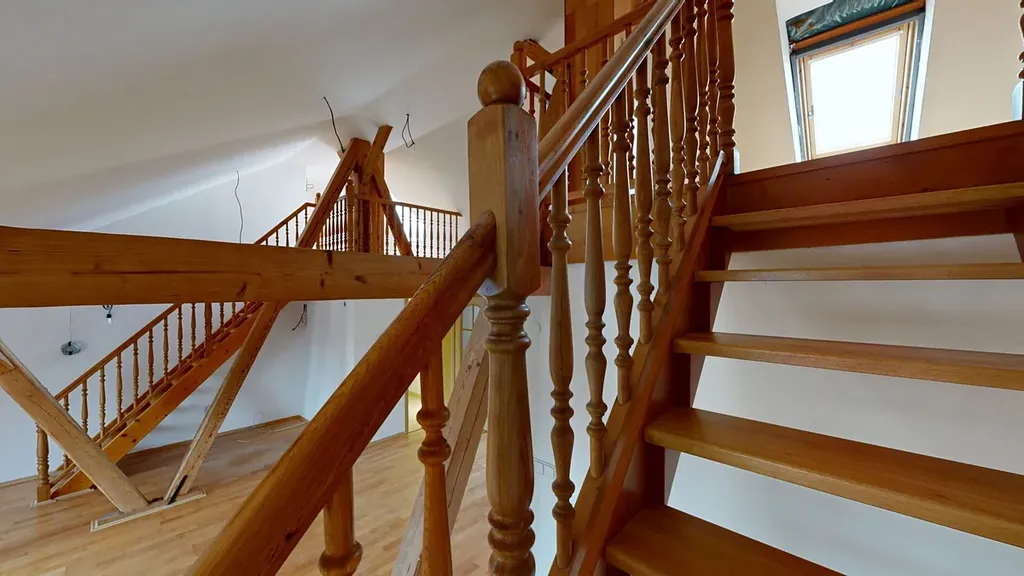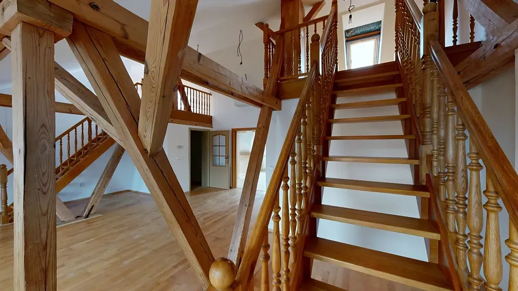 Okna jsou kombinací dřevěných EURO oken a střešních oken, která zajišťují dostatek denního světla. K bytu náleží sklepní kóje v 1. PP.