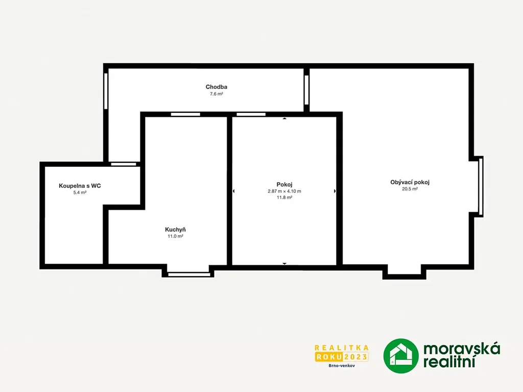 - Chodba (7,61m2), koupelna s WC (5,4m2), kuchyně (10,56m2), ložnice (11,57m2), obývací pokoj (19,78m2)