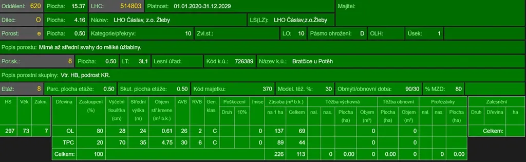 - p.č. 1392 vedená jako lesní pozemek o celkové výměře 5 000 m2 (stáří lesa 79 let - zastoupení dřevin olše, topol černý).