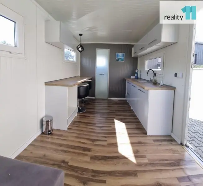 Mobilní domek o velikosti 1kk, 15 m² je plně využitelný a vhodný jak k rekreaci, tak i díky zateplení k celoročnímu užívání.