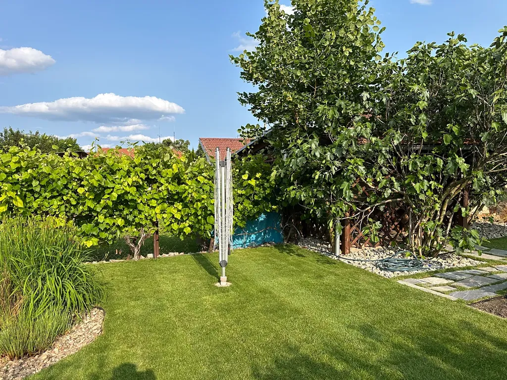 Za domem je zcela uzavřený dvůr s novou WPC terasou s udírnou, dvůr je okrasně upraven. Za dvorem je krásná okrasná zahrada s posezením, druhou (menší) zděnou udírnou, okrasným jezírkem se skalkovou kaskádou a po obvodu s ovocnými stromy a vinnou révou.