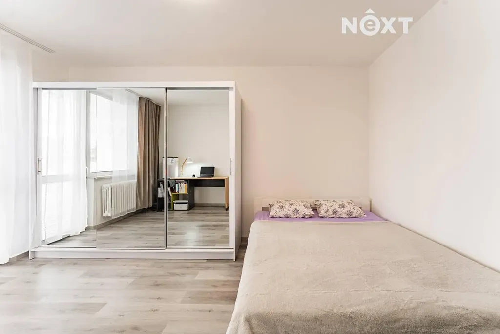 Prostorná ložnice nabízí vstup na zasklenou lodžii, kde si můžete vychutnat chvíle odpočinku a sledovat městský ruch z pohodlí domova. Koupelna s vanou je laděna do moderních šedých tónů v kombinaci s dekorem dřeva. Součástí bytu je také praktická komora, která zajistí dostatek úložného prostoru.
