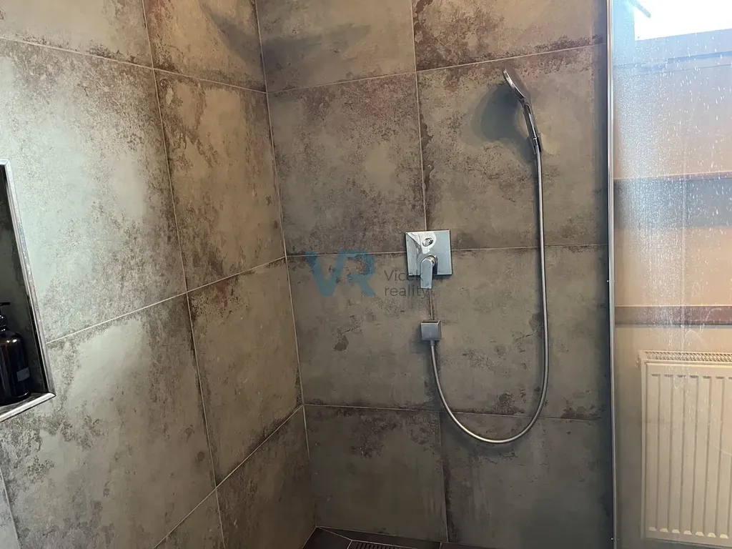 Spodní nová přístavba má dispozici 1+kk, koupelna + WC a pokoj má podlahové vytápění.