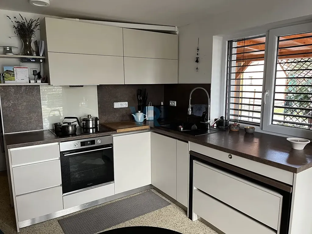 Ve spodním patře je kuchyně, obývák a koupelna s WC, obojí po rekonstrukci.