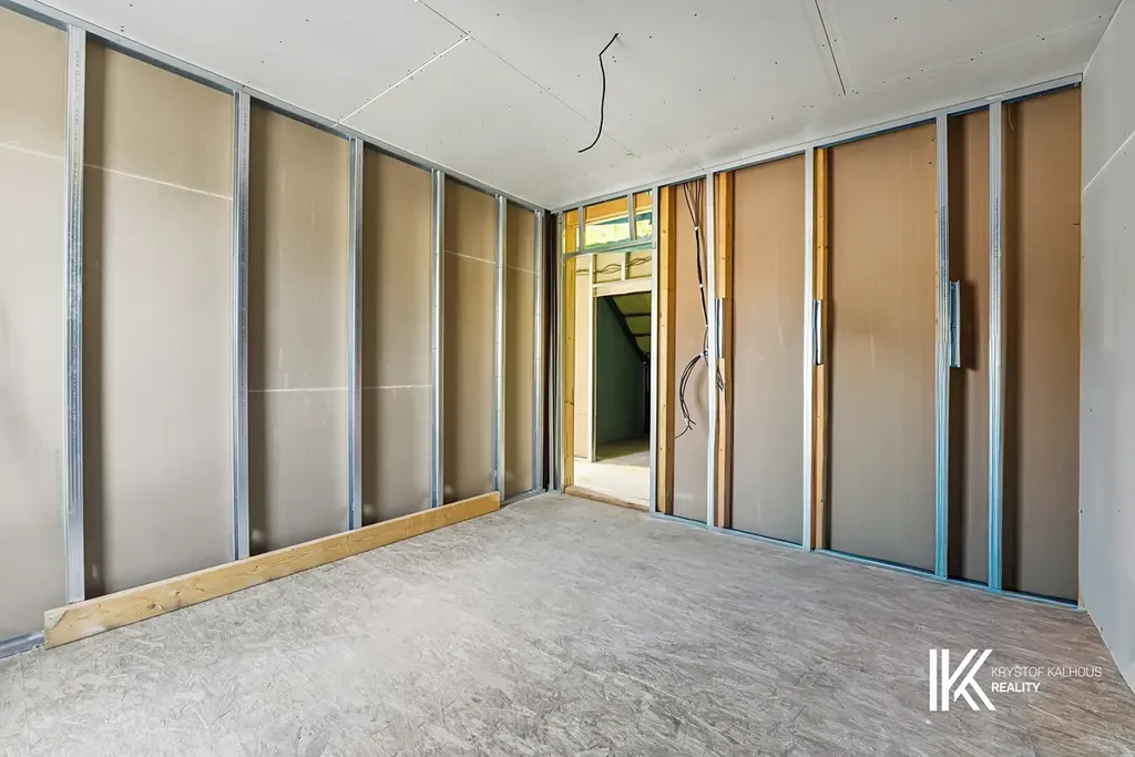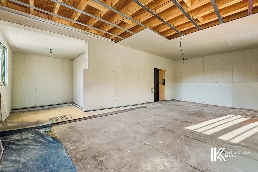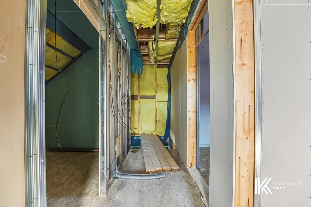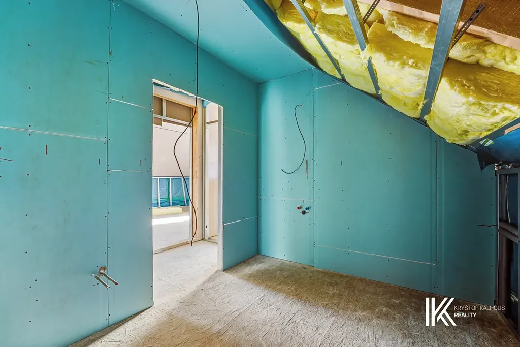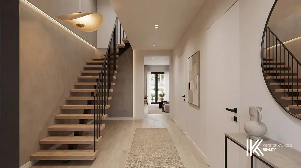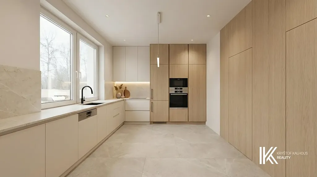 Hlavními dveřmi vstupujete do zádveří, jemuž dominuje masivní schodiště do patra. Zádveří přirozeně pokračuje v obývací pokoj o velikosti 33 m² s navazujícím velkorysým kuchyňským koutem o ploše téměř 11 m². Ke kuchyni navíc přísluší samostatná komora či špíz, která nabídne skvělé úložné možnosti pro potraviny i kuchyňské spotřebiče. Díky přímému napojení na zahradu se interiér přirozeně otevírá ven. Ze zádveří se vstupuje do koupelny se sprchovým koutem typu walk-in o rozměru 90 x 90 cm, toaletou a umyvadlem. Součástí této místnosti je i technické zázemí domu, vše elegantně a prakticky uspořádané. Obklady na stěnách mají velkoformát 60 x 60 cm v odstínu slonové kosti, dlažba je v tmavě béžové barvě stejného rozměru, což vytváří nadčasový, čistý základ, který snadno doplníte o vlastní styl. Praktickým bonusem přízemí je také samostatná šatna – ideální nejen na sezónní oblečení, ale klidně i jako úložný prostor pro sportovní vybavení nebo věci, které nechcete mít na očích.