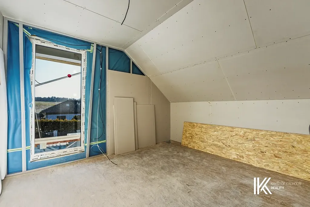 Po masivním schodišti vystoupáte do patra, které tvoří klidovou zónu domu. Nacházejí se zde tři samostatné pokoje, které dávají naprostou flexibilitu využití. Pokoje jsou oddělené, takže každý člen rodiny zde najde své soukromí a vlastní prostor. Horní koupelna je vybavena vanou o délce 170 cm, toaletou a umyvadlem a je designově sjednocena se spodní koupelnou stejnými obklady a dlažbou, což domu dodává jednotný a harmonický výraz.