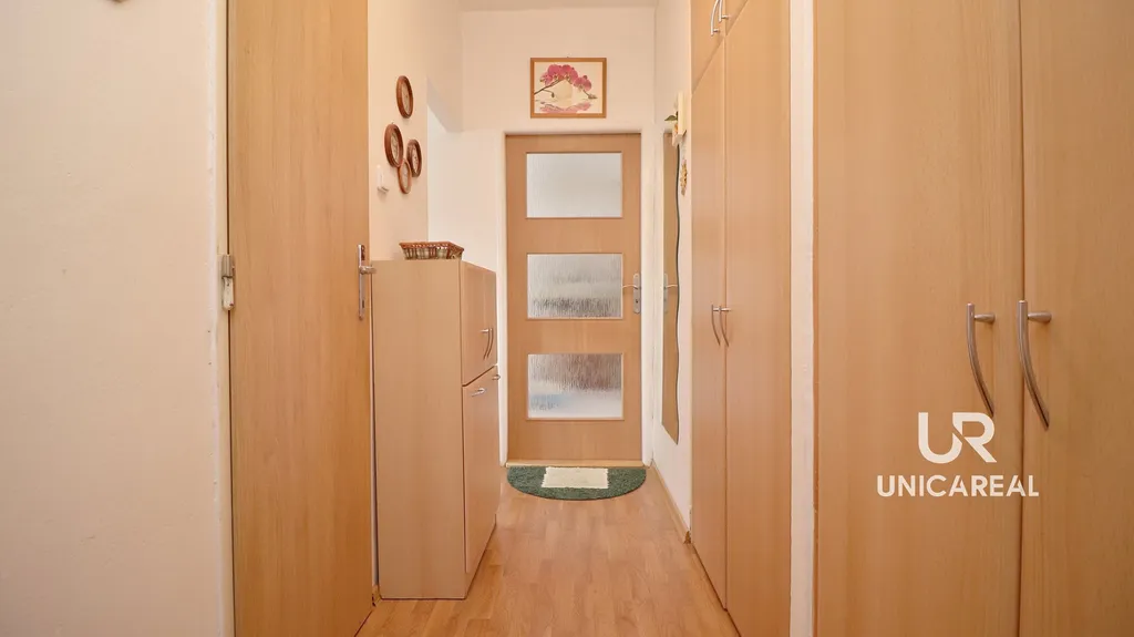Dispozice je praktická a funkční. Z chodby s vestavěnými úložnými skříněmi je vstup do koupelny se sprchovým koutem, na samostatné WC, do kuchyně a prostorného obývacího pokoje. Na obývací pokoj navazuje další pokoj. Ložnice má dva vstupy – z kuchyně i z obývacího pokoje, což dává bytu variabilitu využití. Velkým benefitem jsou dva balkony – jeden přístupný z obývacího pokoje, druhý z přilehlého pokoje.